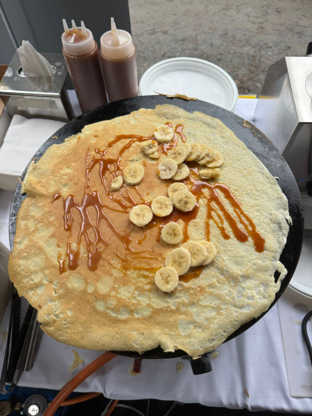 • Hvězda Dne: Naše slavné palačinky s hřejivým, táhlým karamelem a čerstvými plátky banánu. Nic neudělá chladný adventní den lepším než tato klasická kombinace! (Jak můžete vidět na fotce, karamelem jsme nešetřili!)
